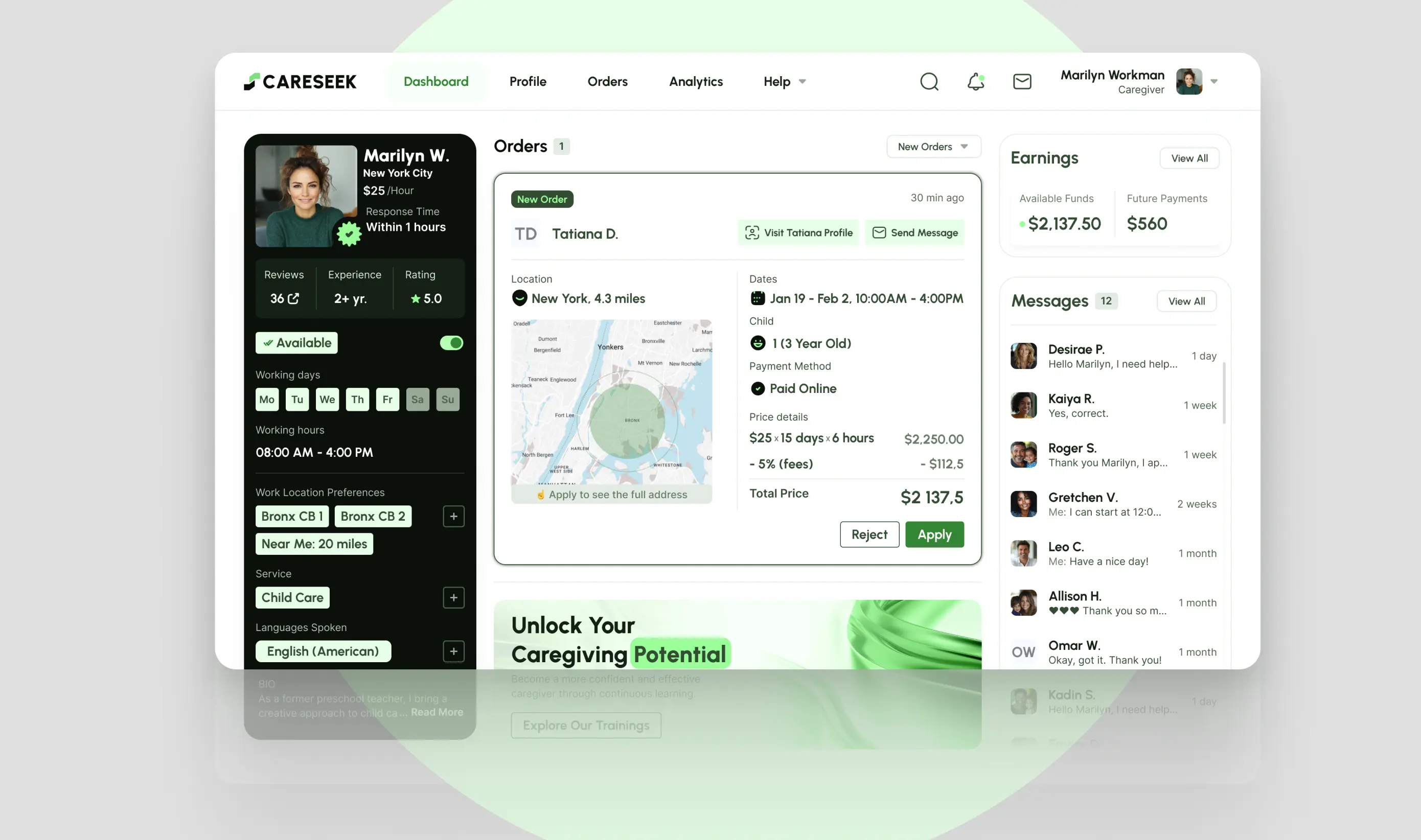 Caregivers: Emphasis on profile setup, availability management, order acceptance, and earnings tracking