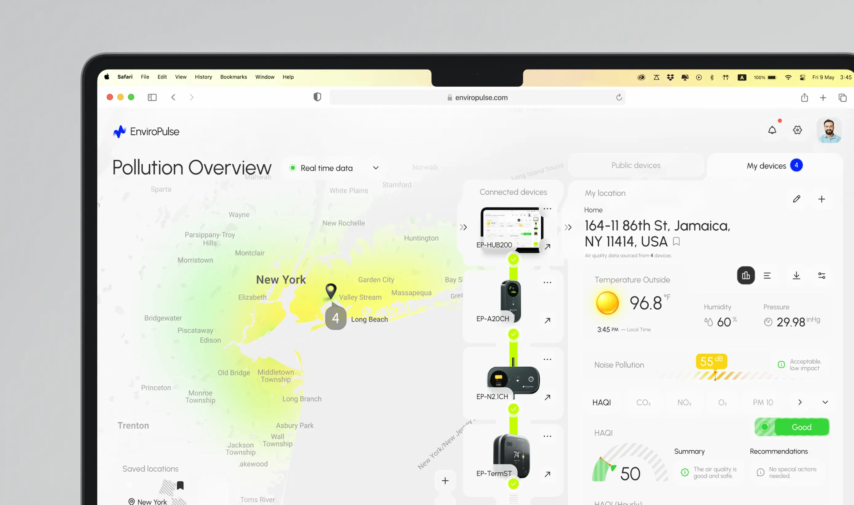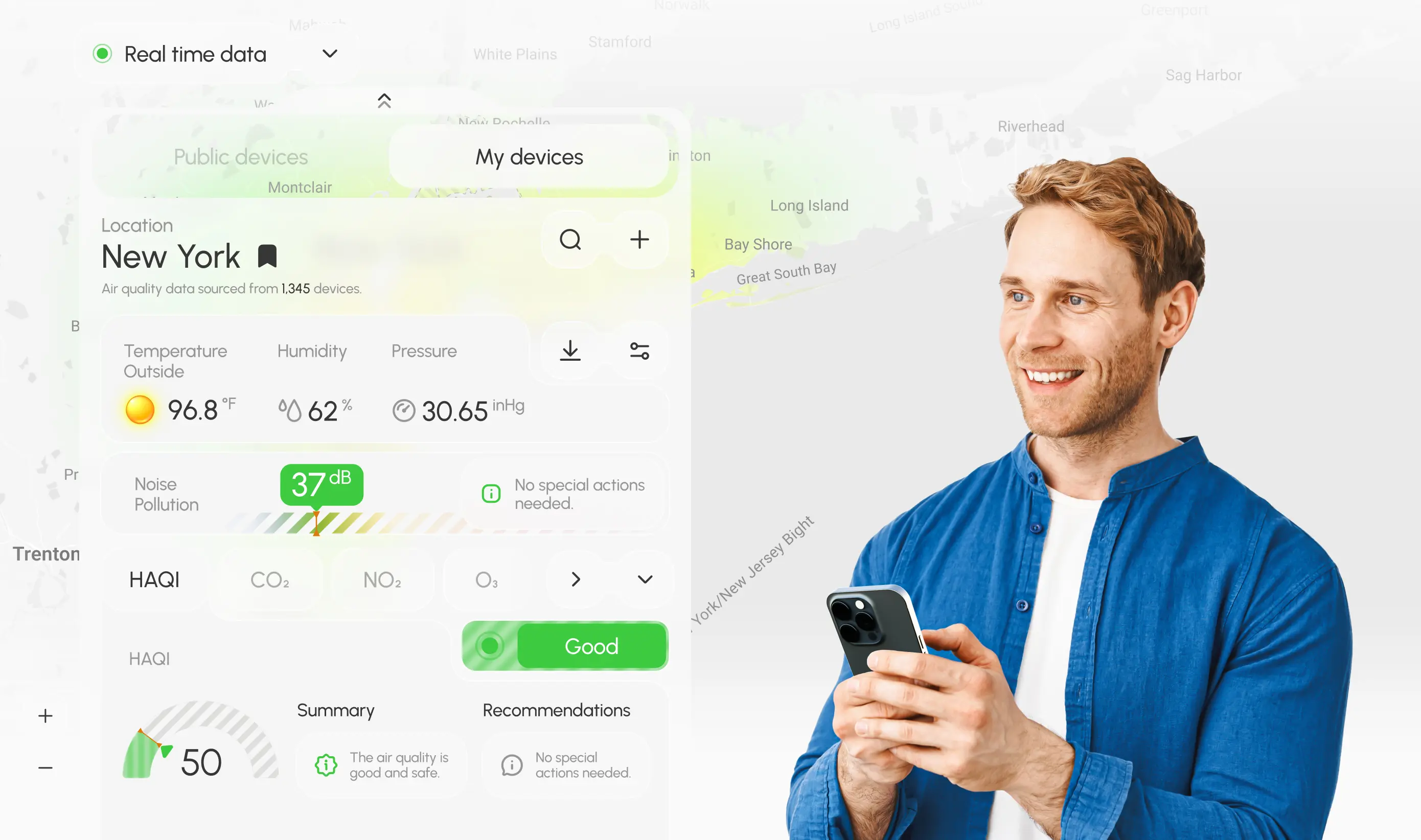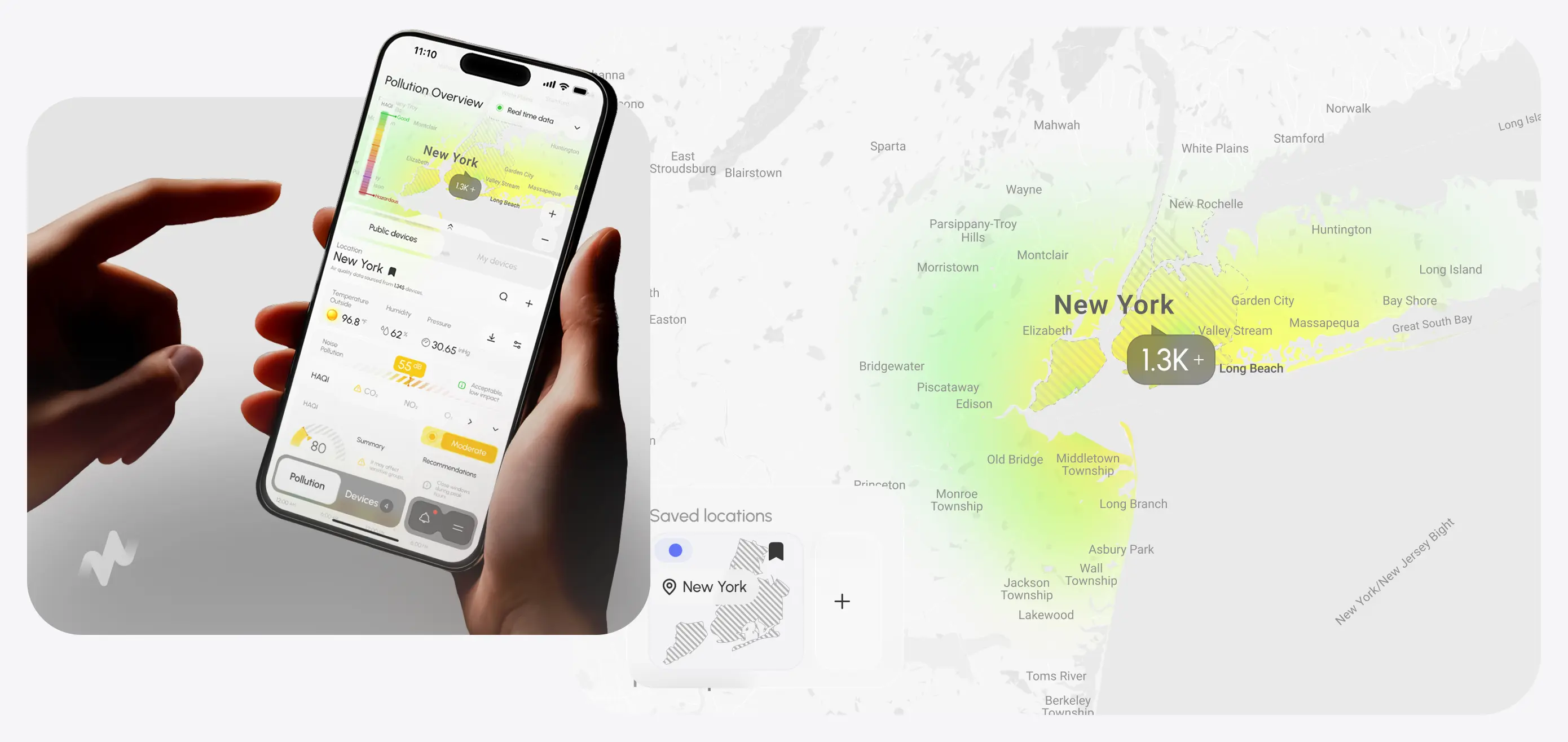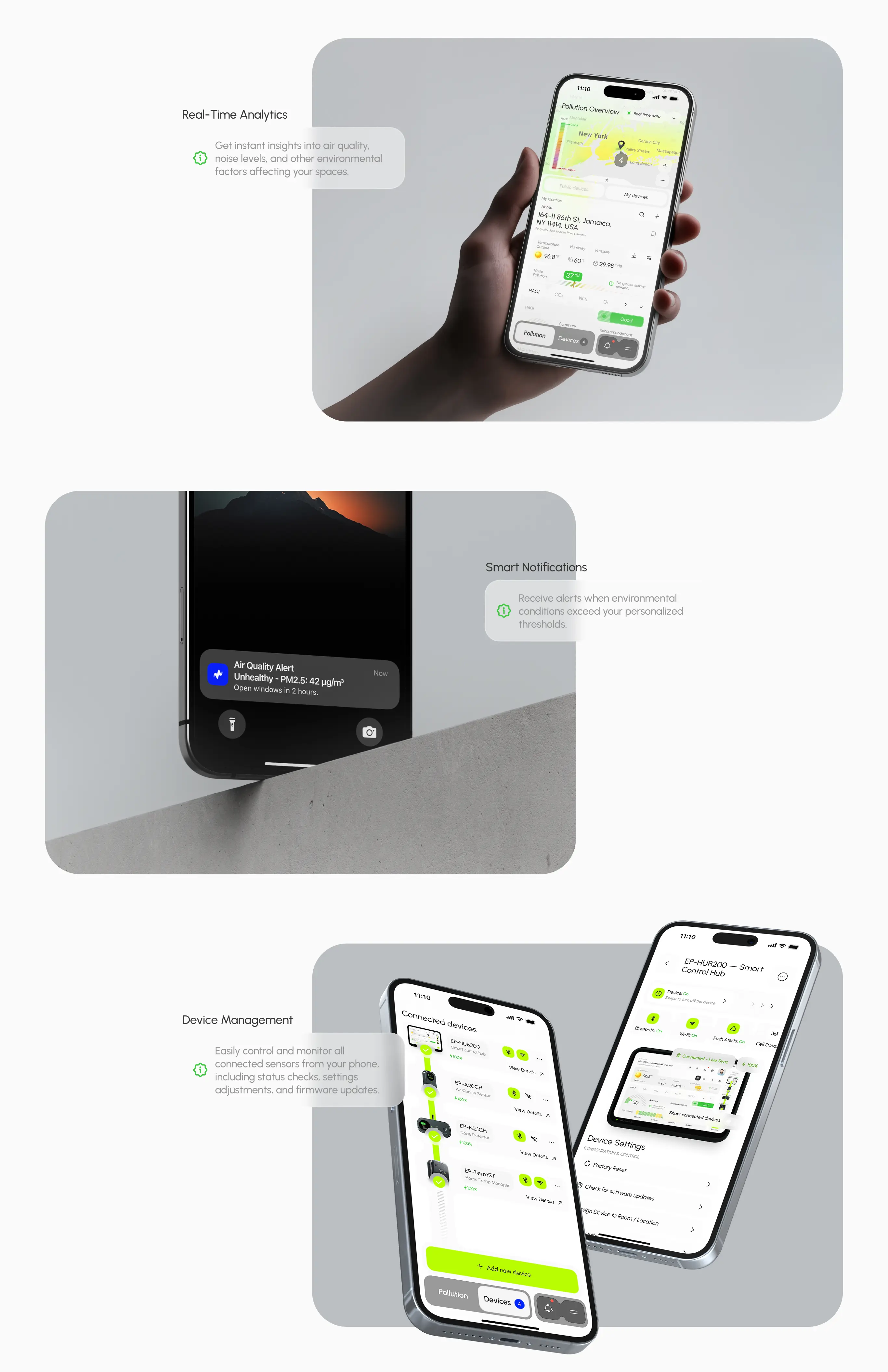 The environmental monitoring market presents unique challenges: complex data interpretation, fragmented device ecosystems, and difficulty translating readings into actionable insights. Users need a simple way to monitor both public and personal environmental data through an intuitive interface that presents complex pollution data in an accessible way.