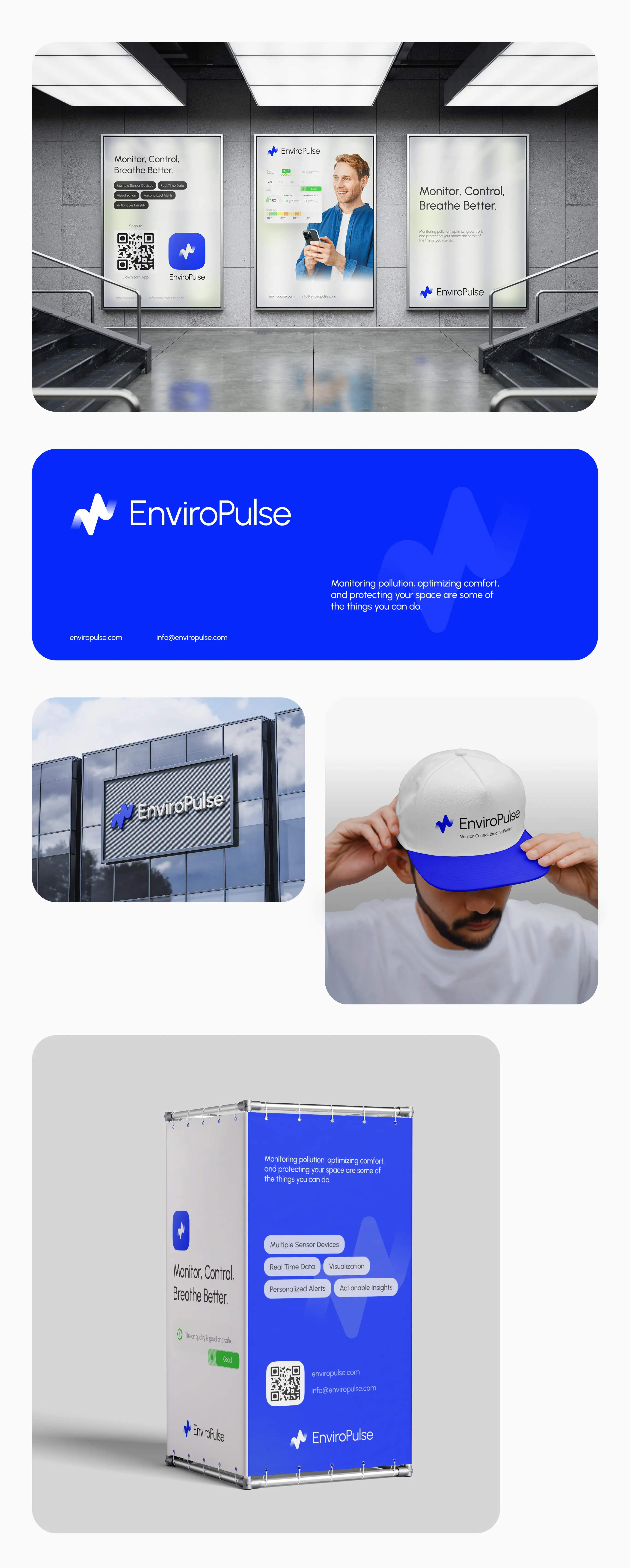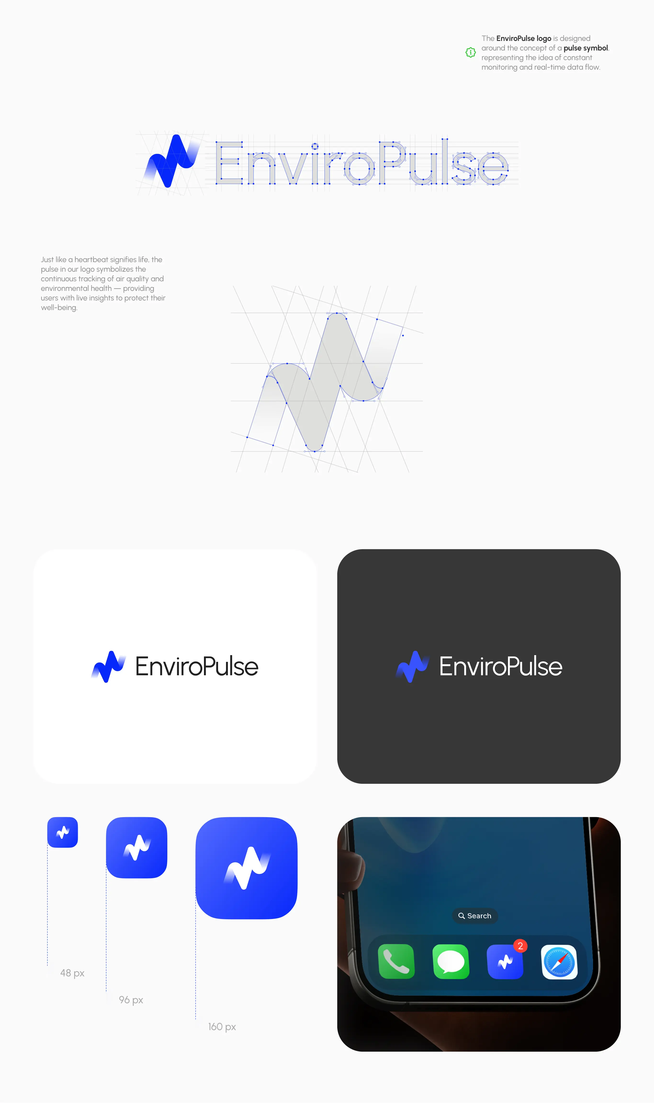 The EnviroPulse logo is designed around the concept of a pulse symbol, representing the idea of constant monitoring and real-time data flow. Just as a heartbeat signifies life, the pulse in the logo symbolizes the continuous tracking of air quality and environmental health—providing users with live insights to protect their well-being.