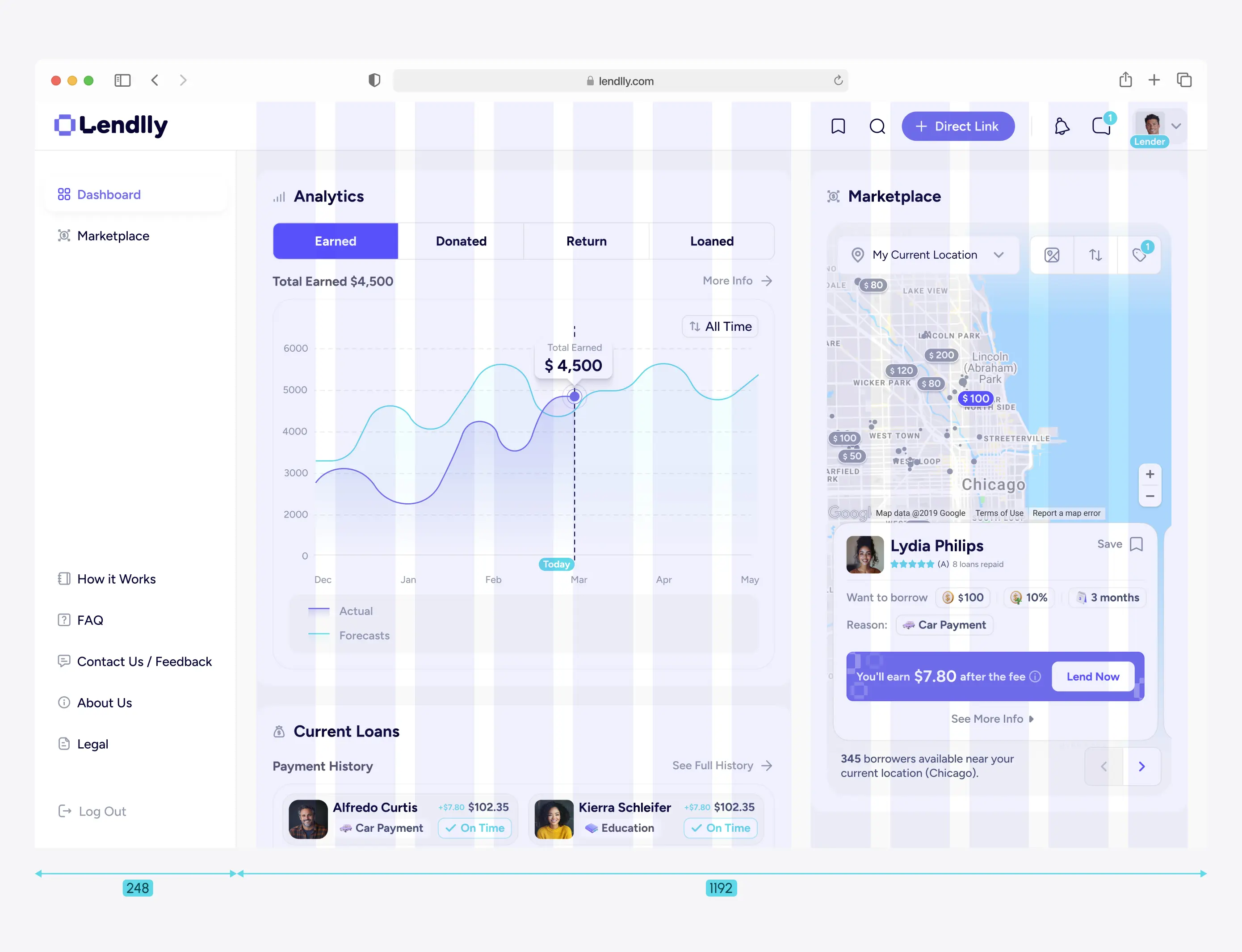 Performance Analytics: Visual data on lending history and earnings